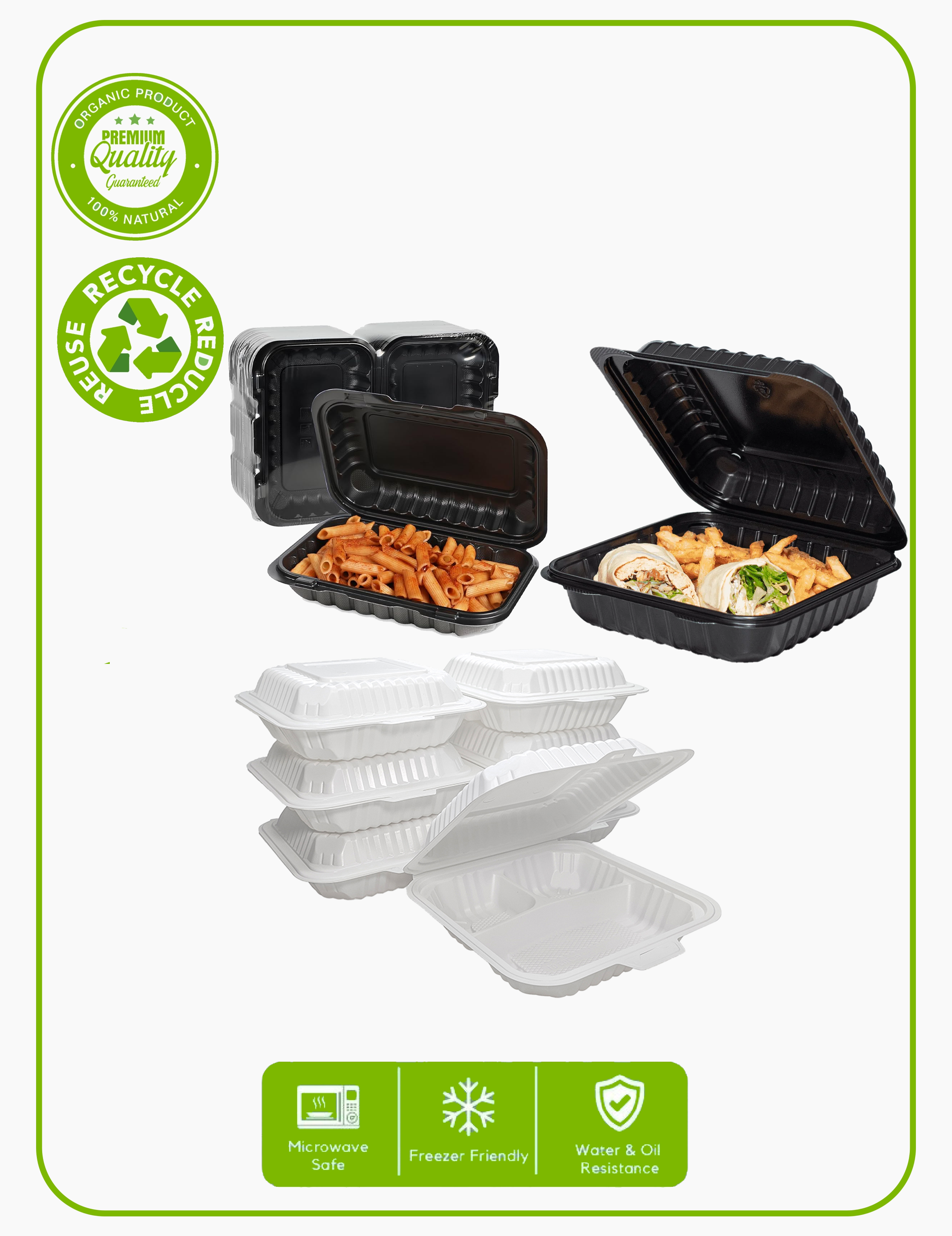 Our cornstarch-based food containers offer an eco-conscious alternative to traditional plastic packaging without compromising on strength or performance. Made from 100% biodegradable and renewable plant materials, they naturally decompose without leaving harmful residues, helping your business reduce its environmental impact with confidence.