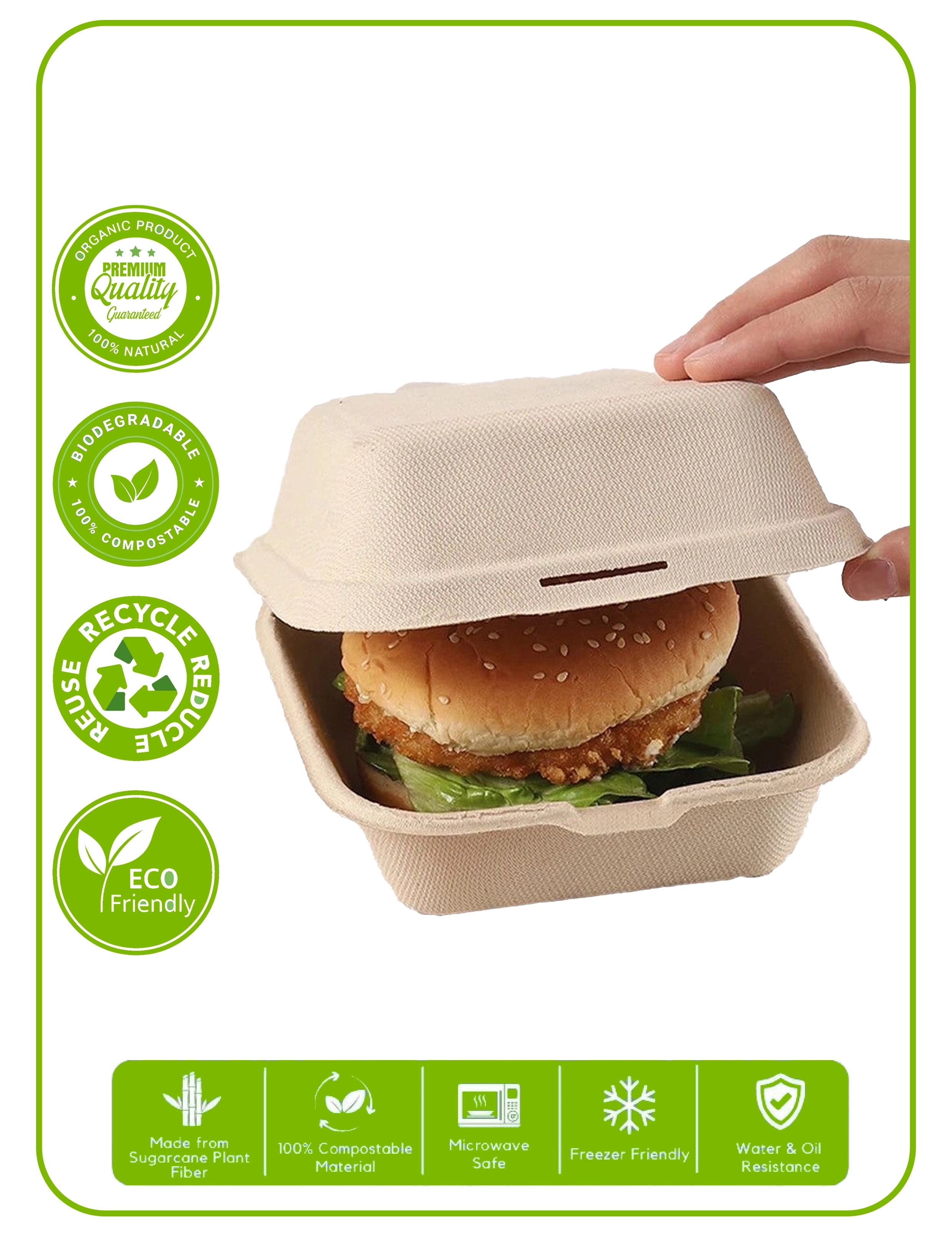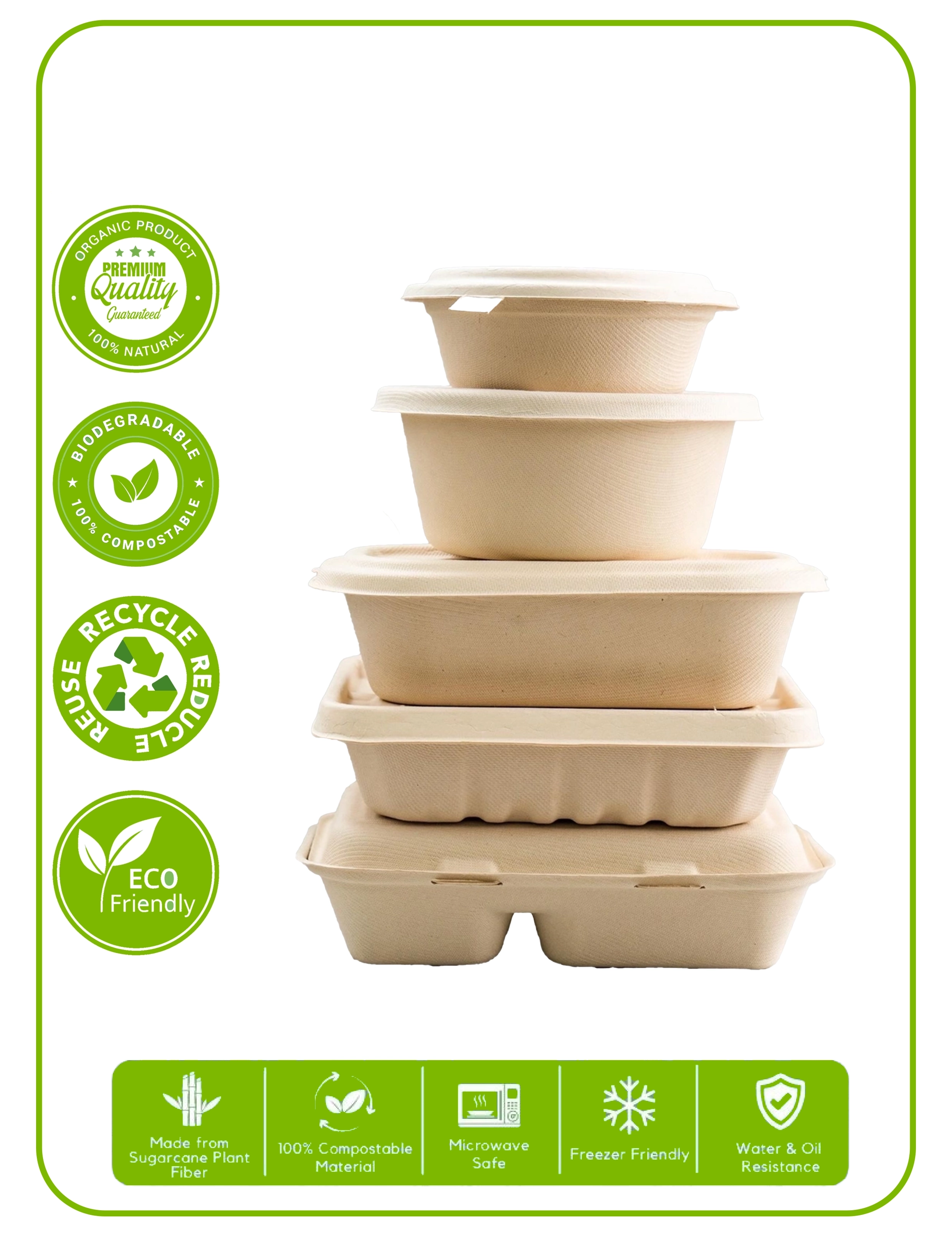 Crafted from natural sugarcane bagasse, a byproduct of sugar production, these containers turn agricultural waste into high-performance packaging. They offer the strength of traditional plastic without the environmental harm, making them ideal for eco-conscious businesses.