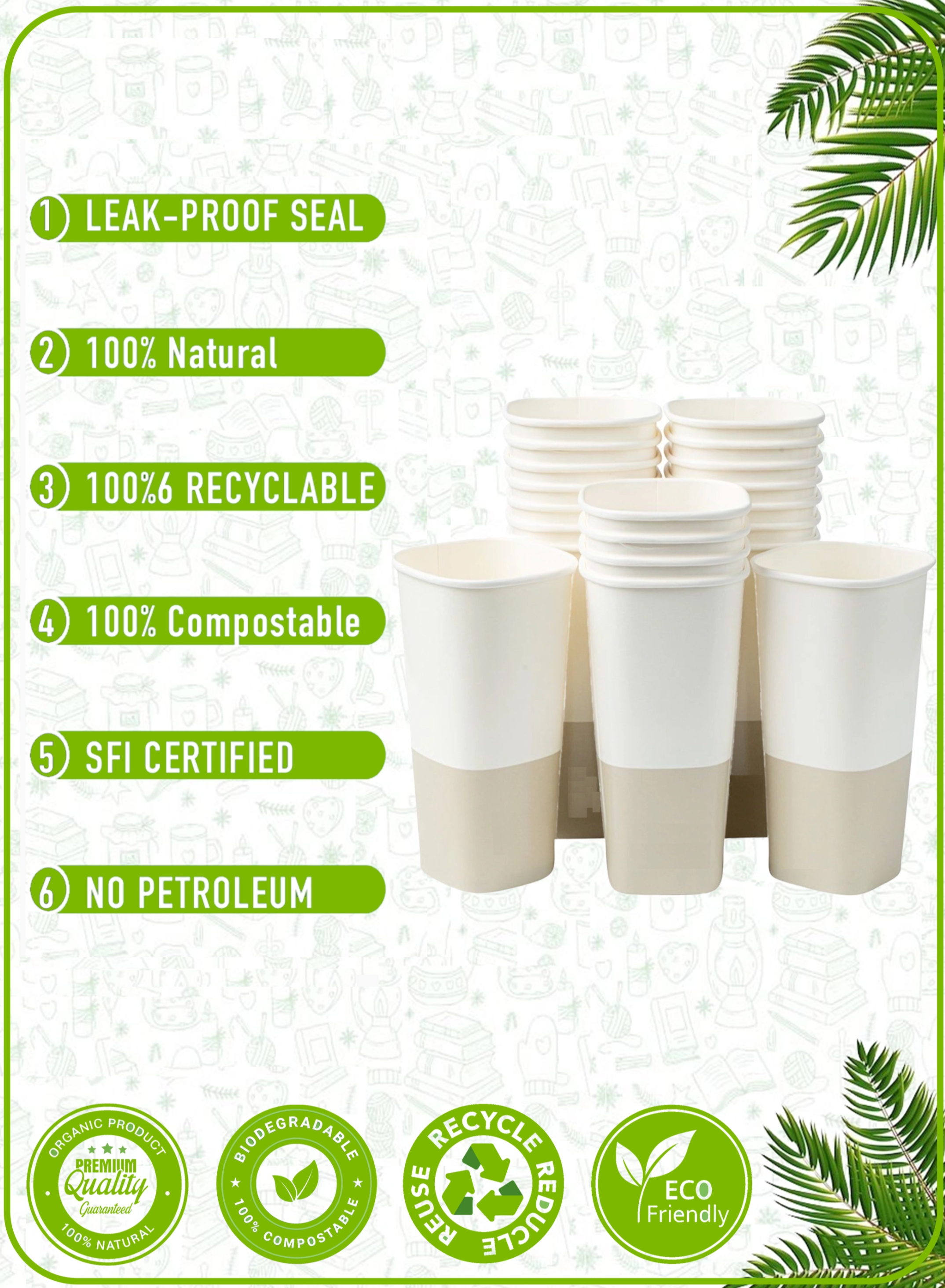 Disposable cups made primarily out of paper, often with a thin layer of plastic or wax coating to prevent liquids from soaking through. Used for serving hot or cold beverages like coffee, tea, juice, or water.