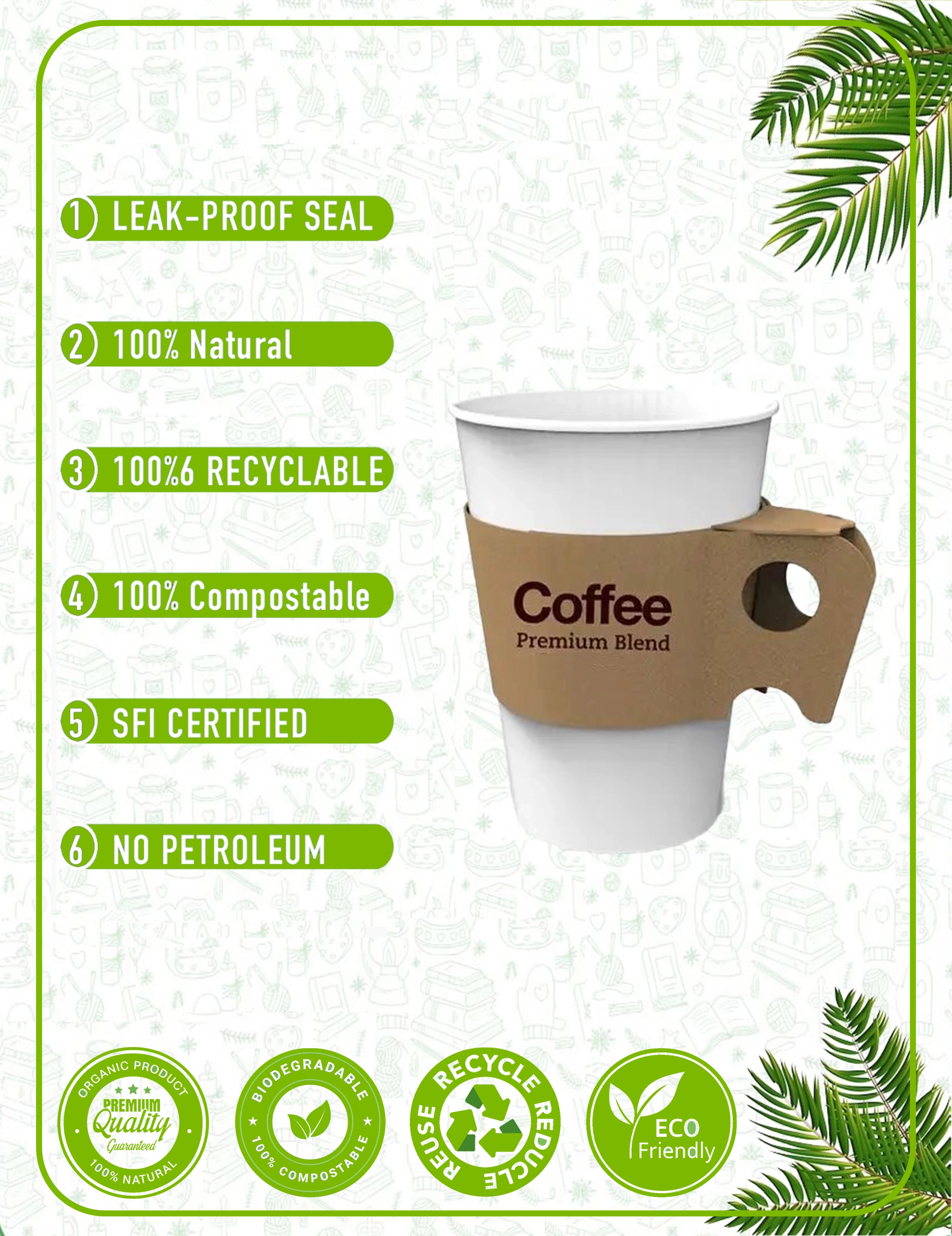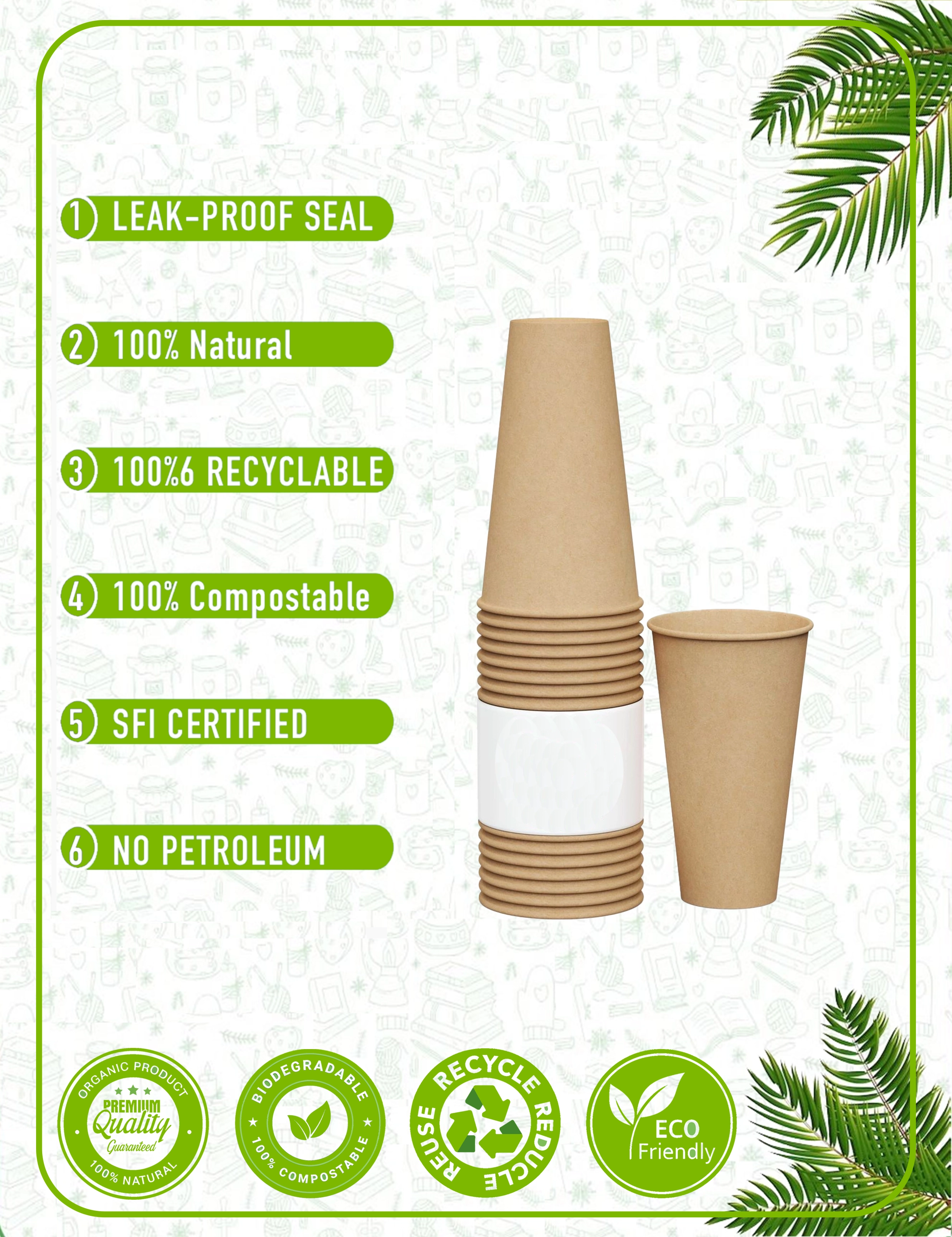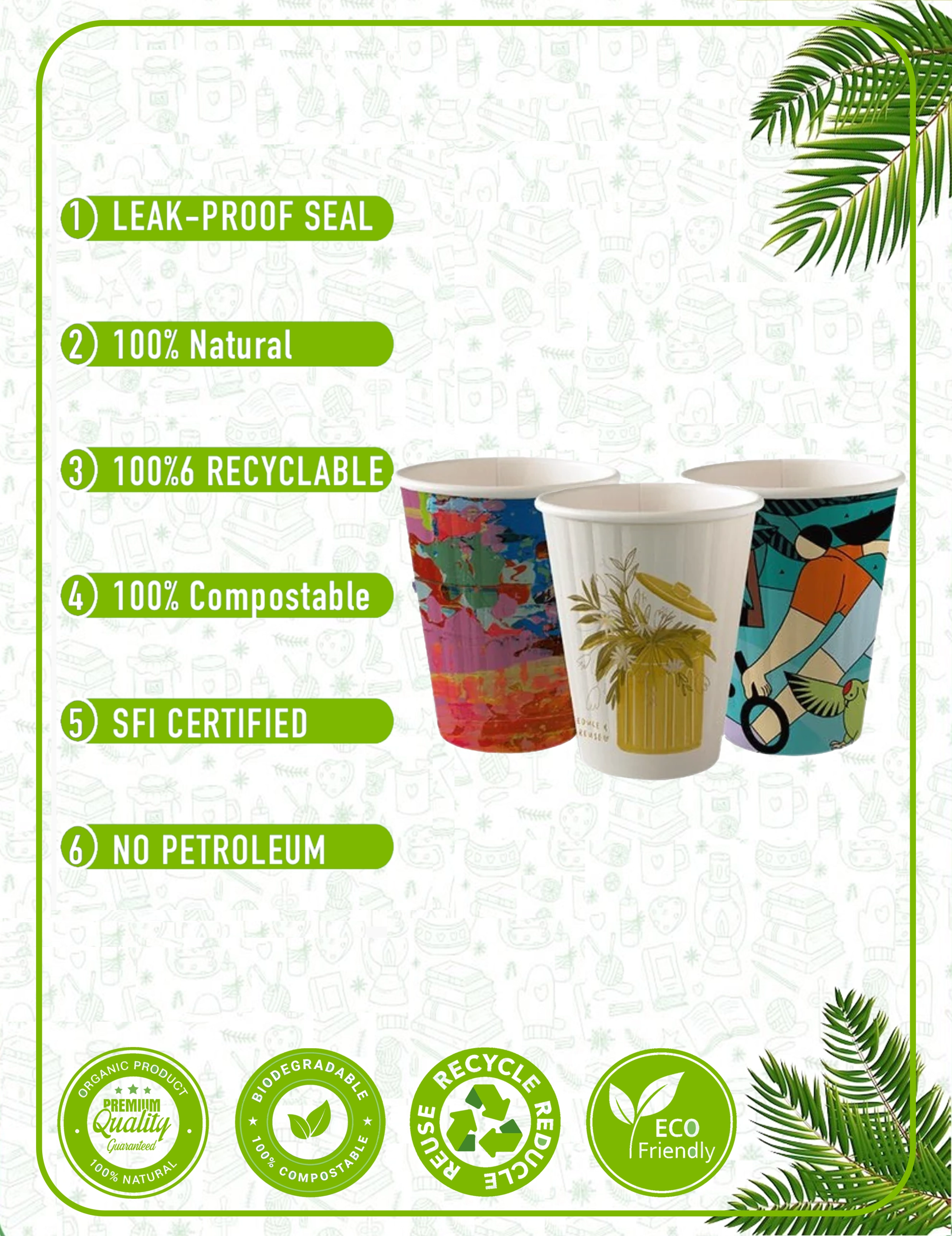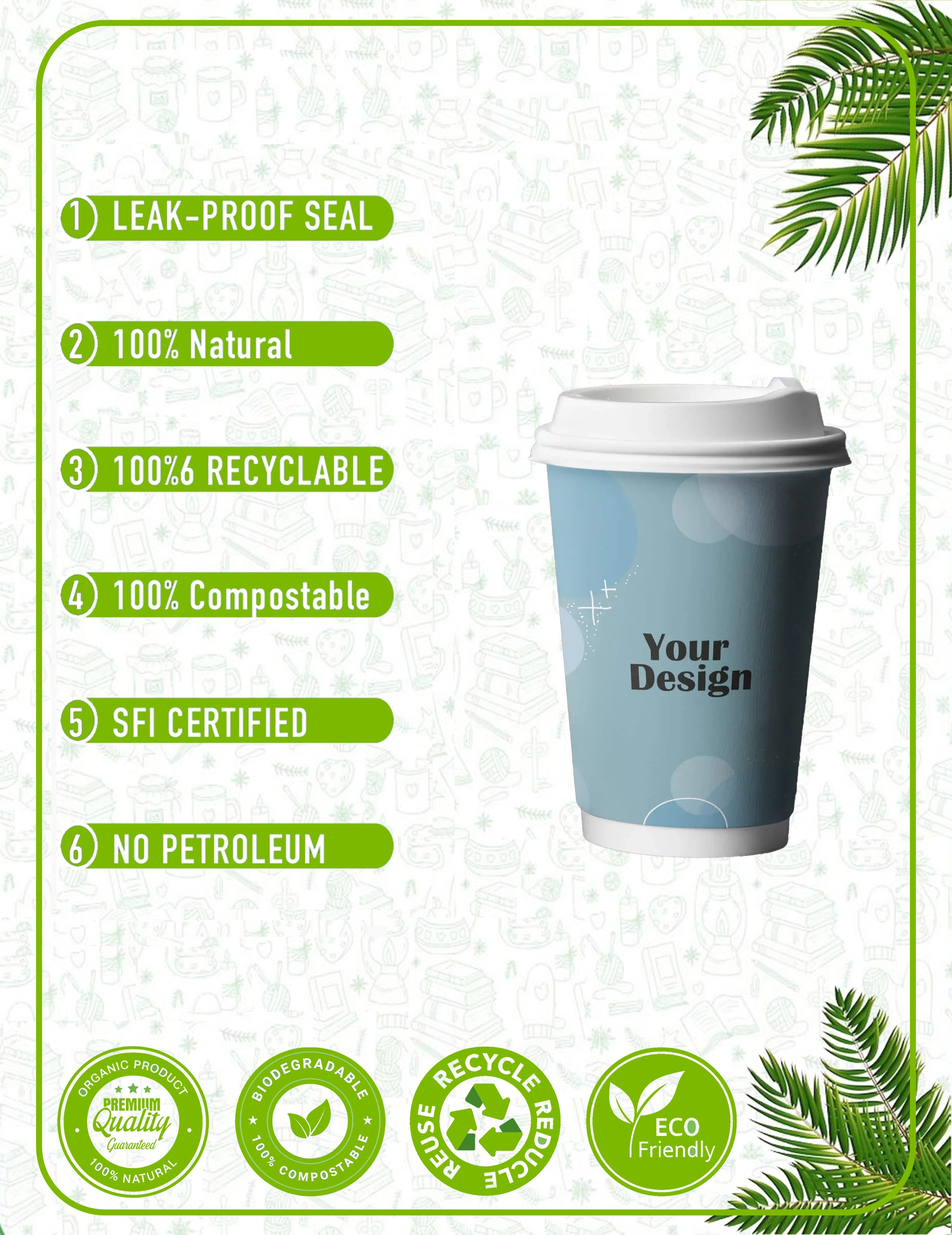 Our paper cups are crafted from responsibly sourced materials with plant-based linings. We prioritize eco-friendly solutions that reduce environmental impact without compromising quality. Every cup and packaging accessory is designed with circular economy principles in mind - from recyclable paper cups to compostable lids and biodegradable sleeves.