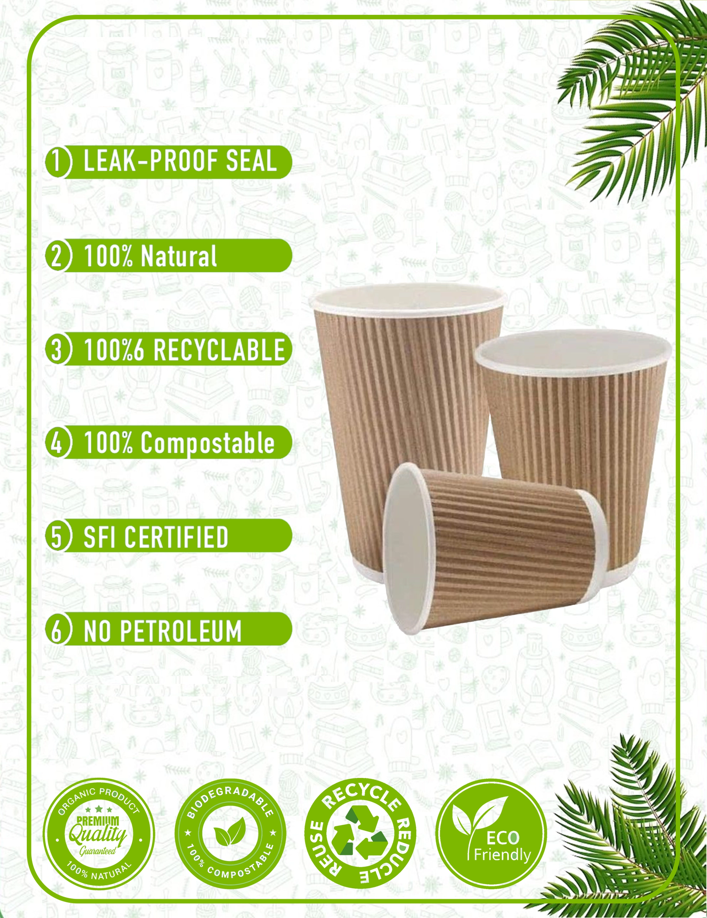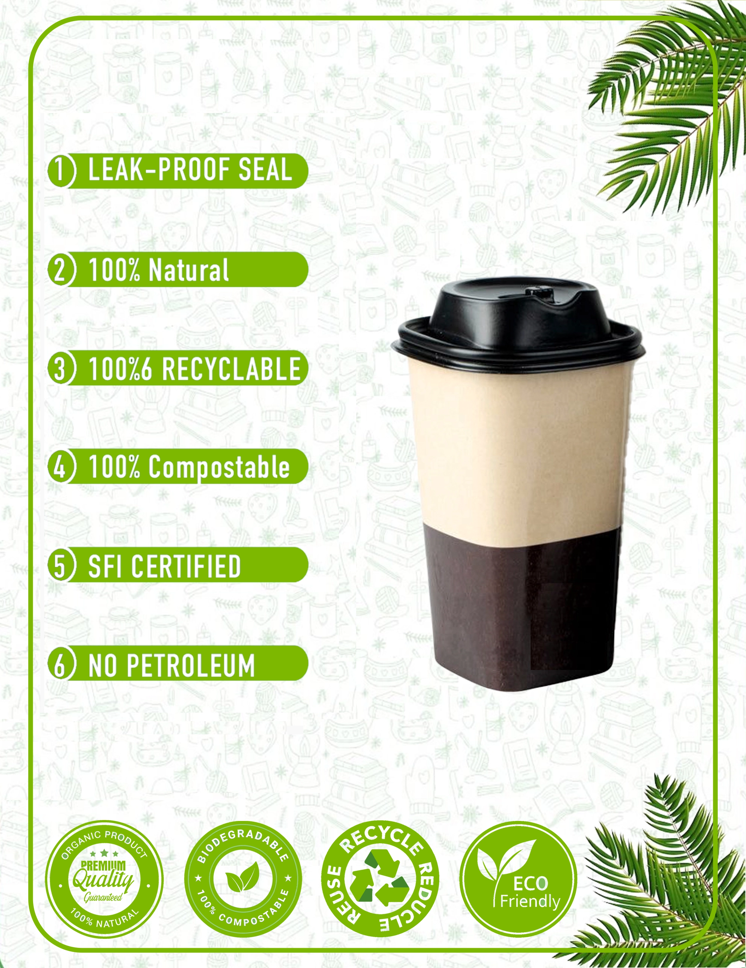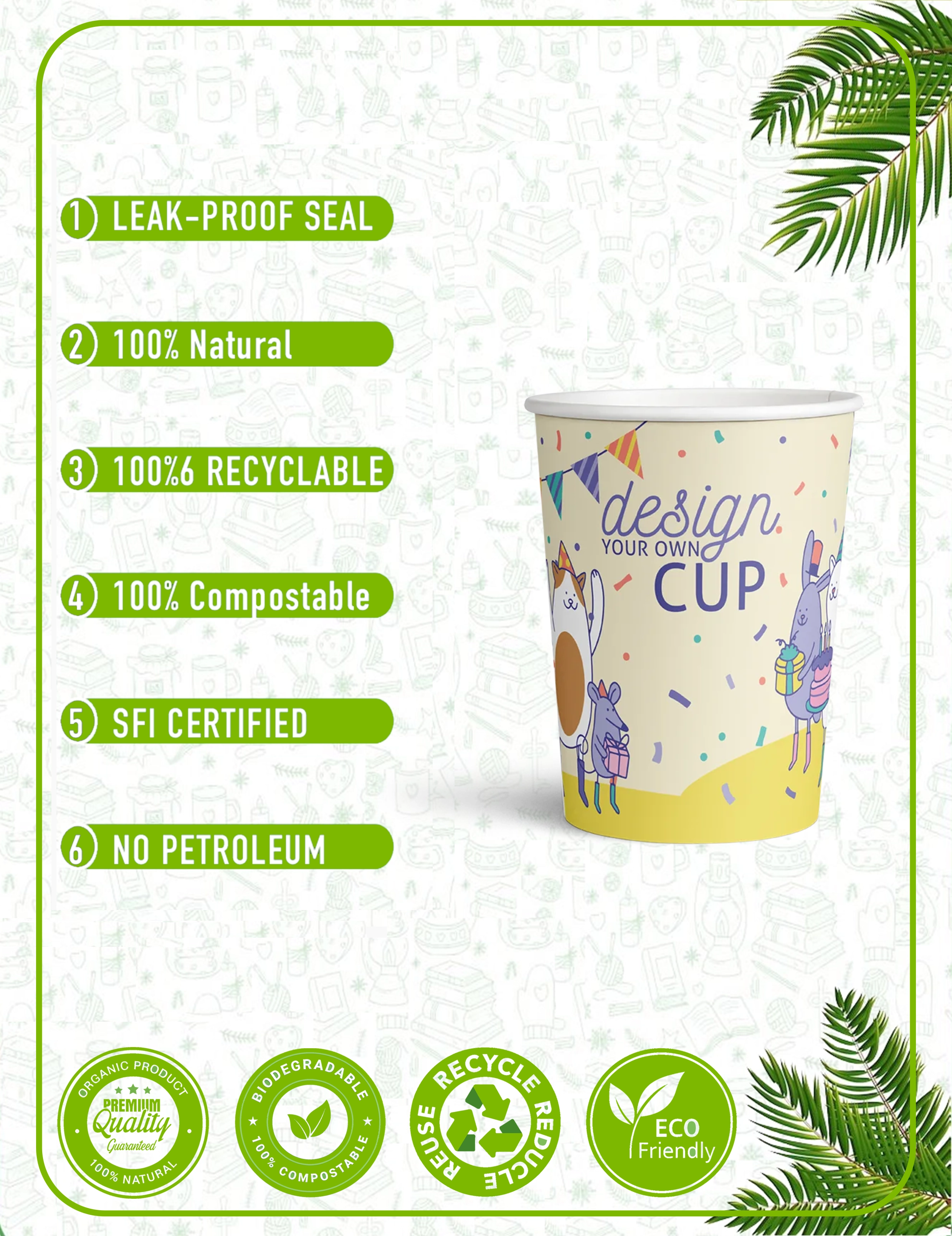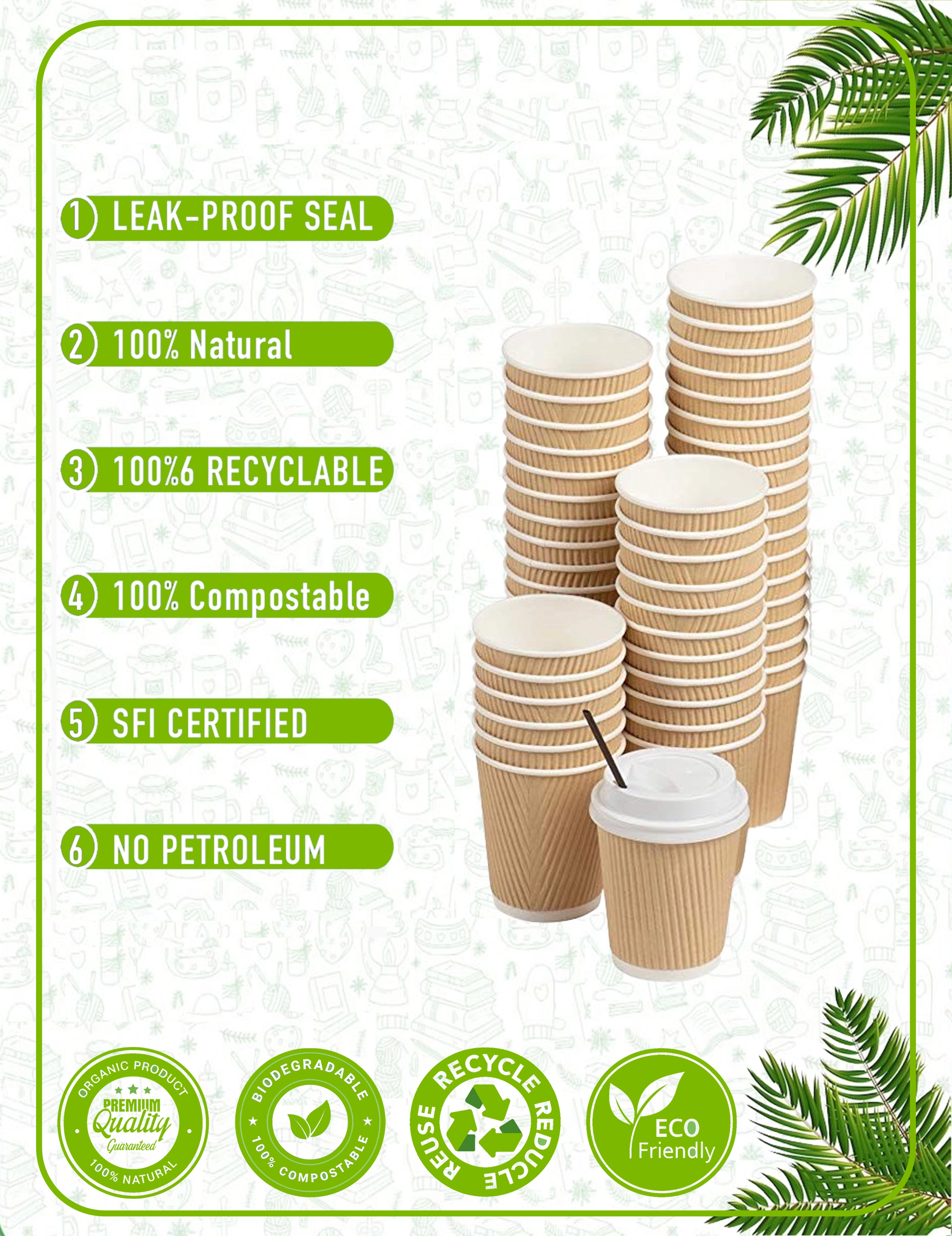 Our paper cups are crafted from responsibly sourced materials with plant-based linings. We prioritize eco-friendly solutions that reduce environmental impact without compromising quality. Every cup and packaging accessory is designed with circular economy principles in mind - from recyclable paper cups to compostable lids and biodegradable sleeves.