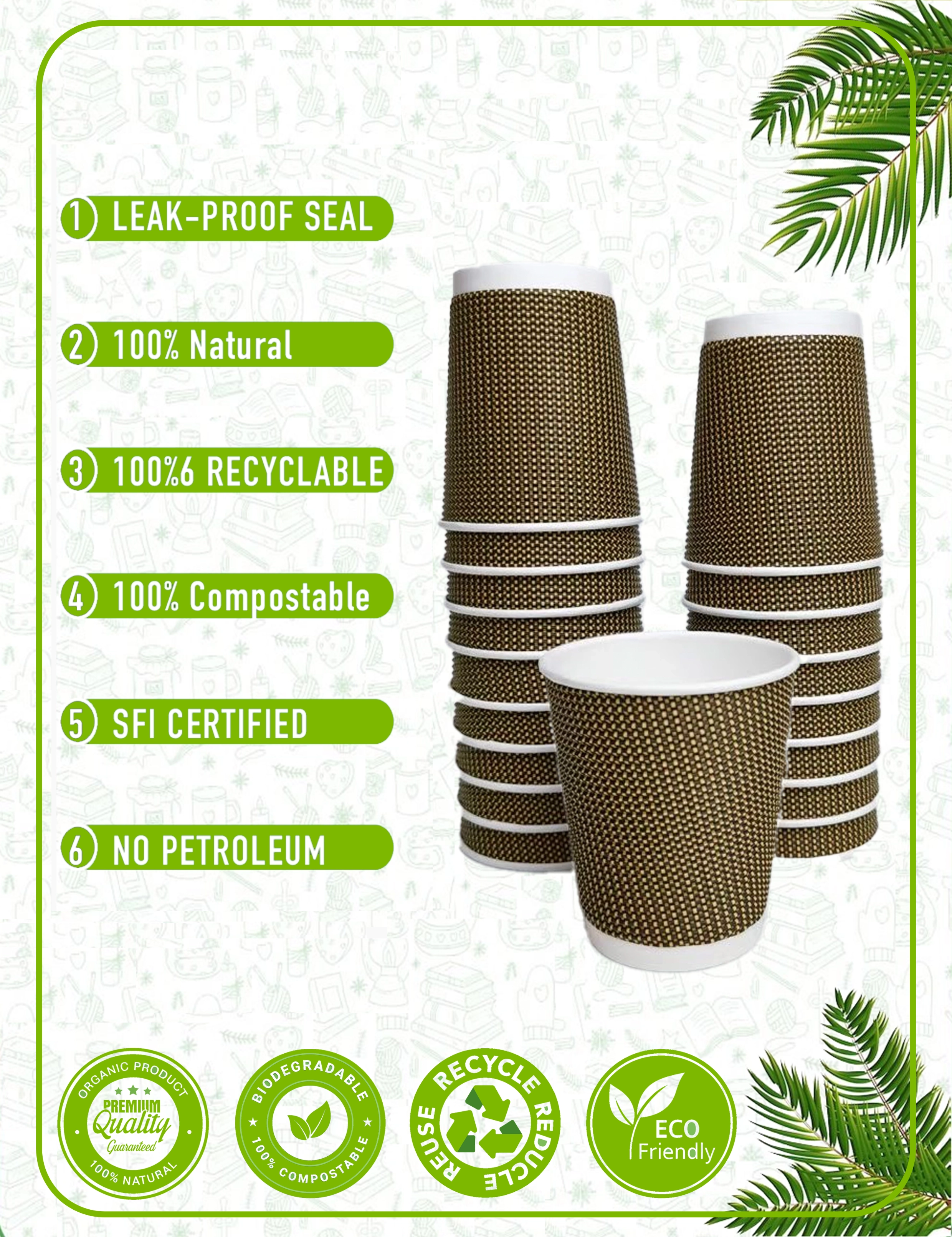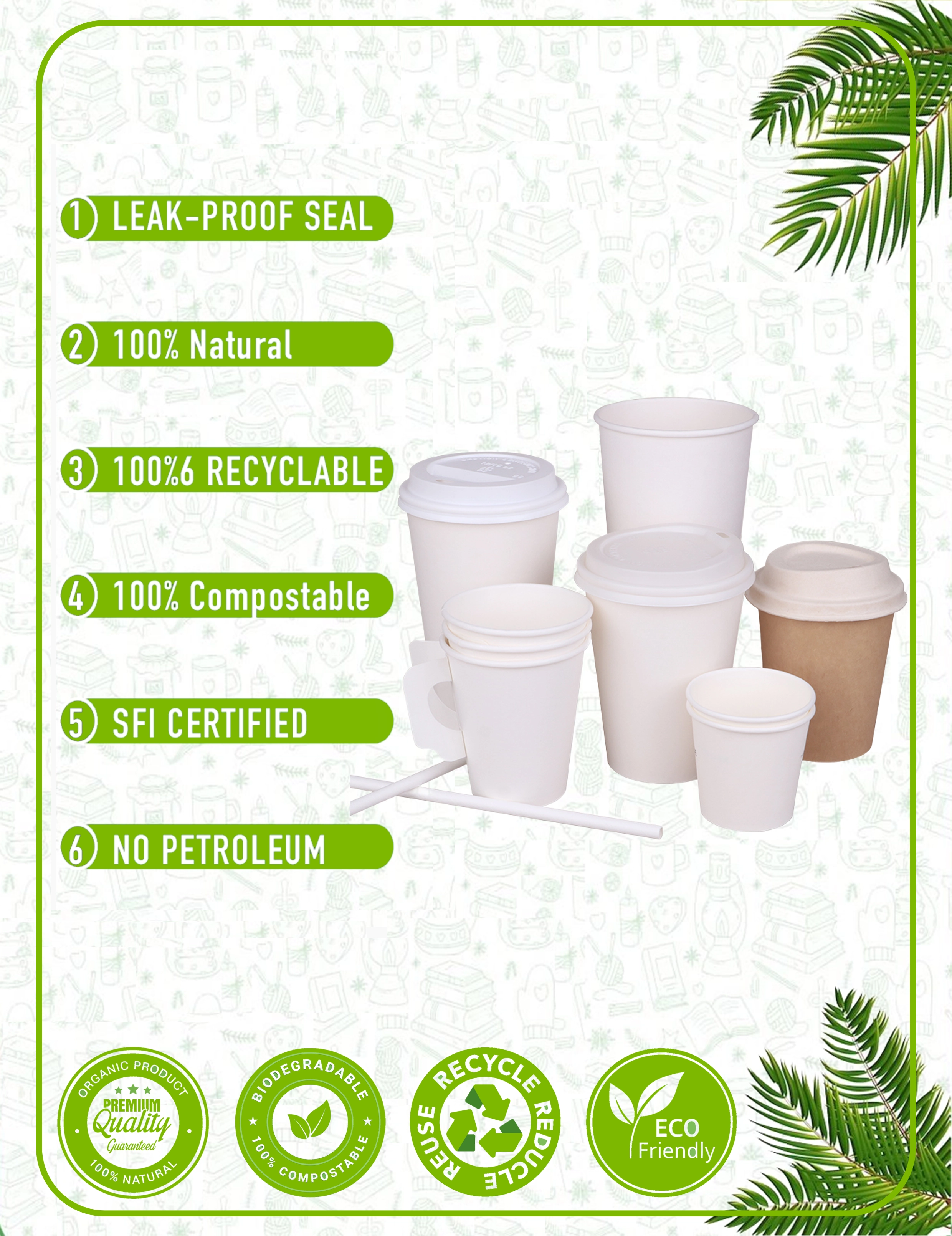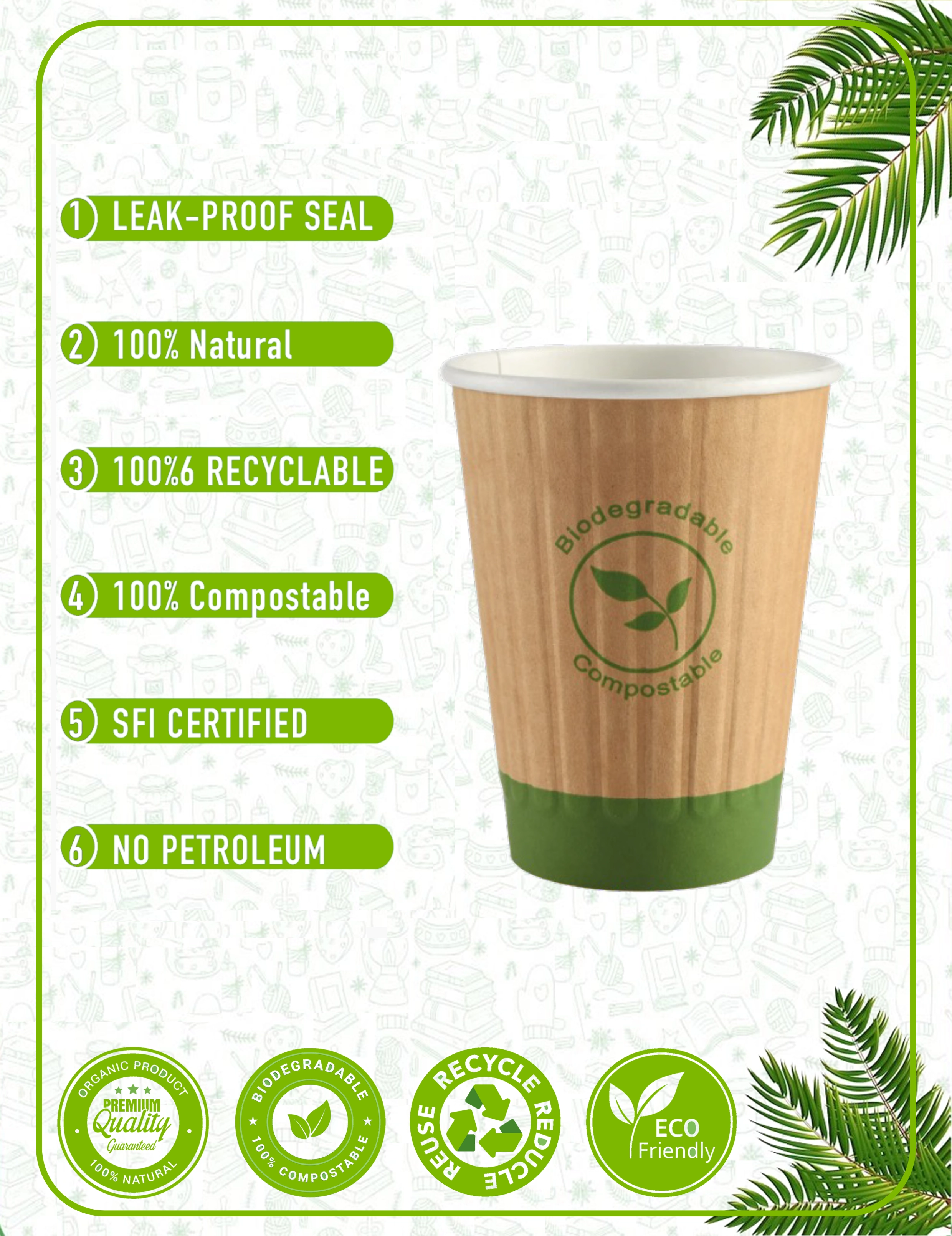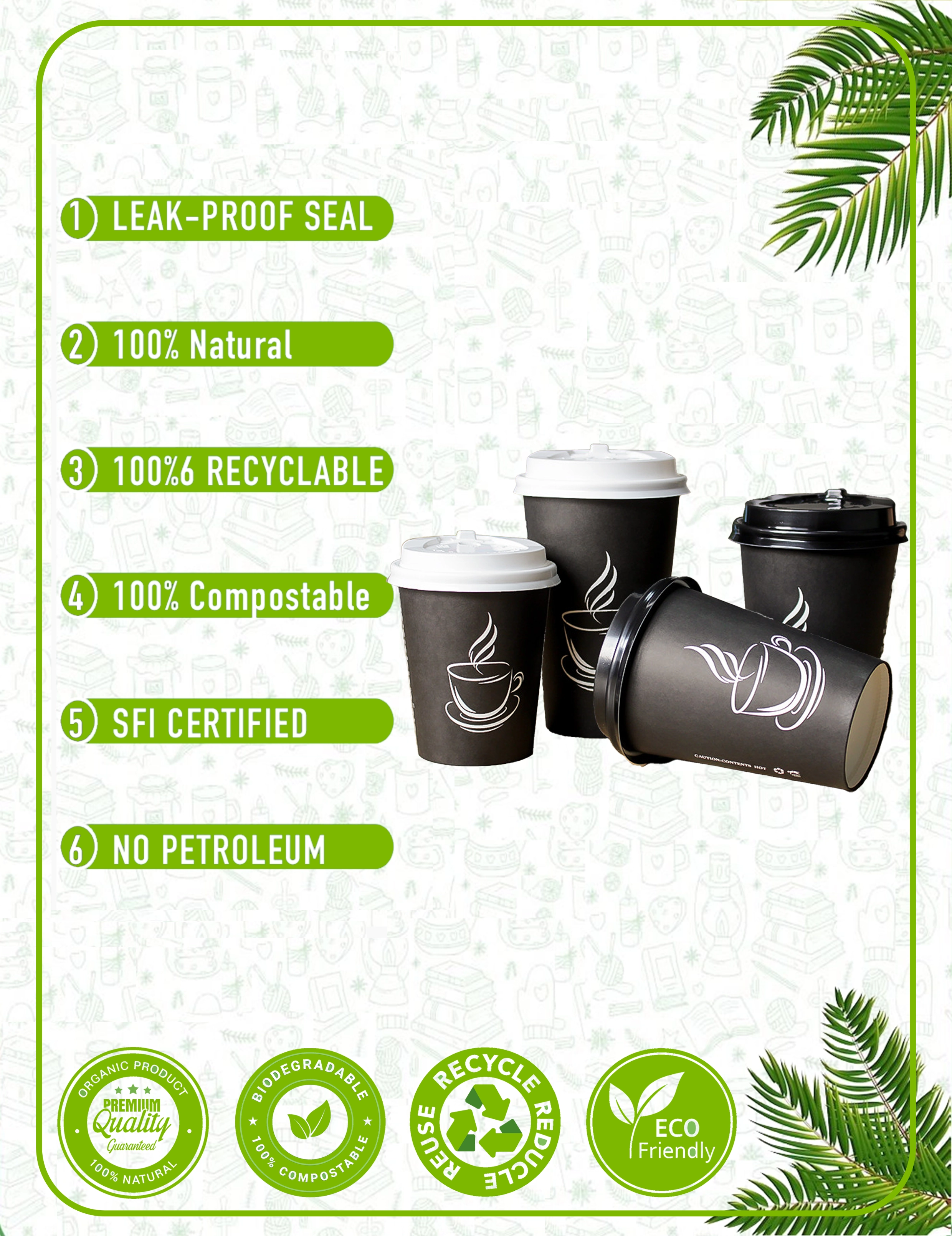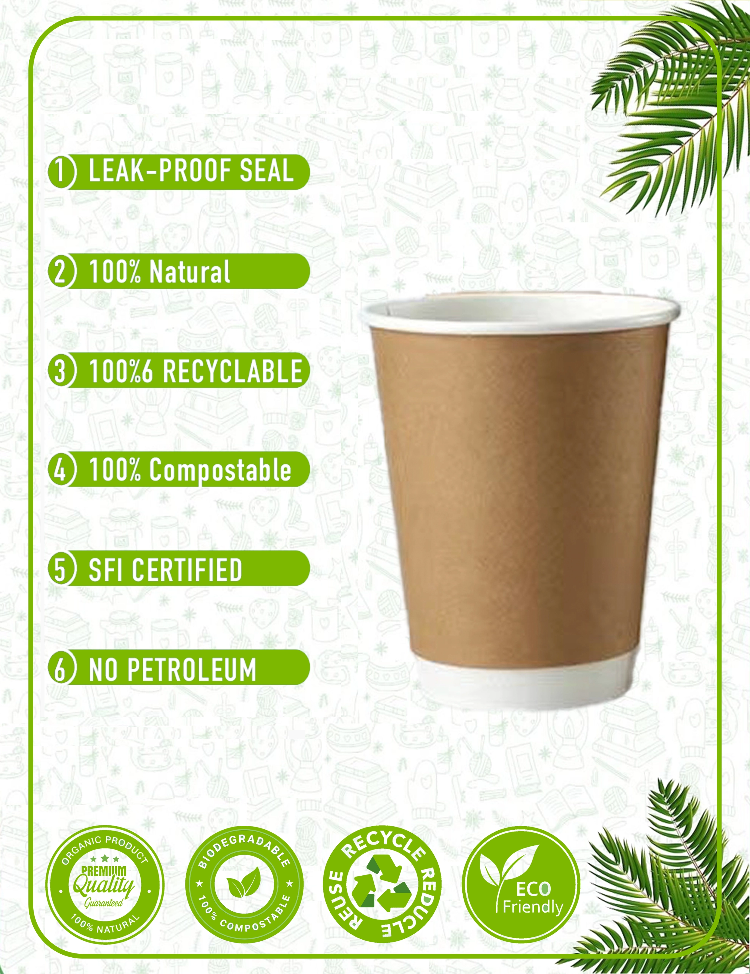Our paper cups are crafted from responsibly sourced materials with plant-based linings. We prioritize eco-friendly solutions that reduce environmental impact without compromising quality. Every cup and packaging accessory is designed with circular economy principles in mind - from recyclable paper cups to compostable lids and biodegradable sleeves.