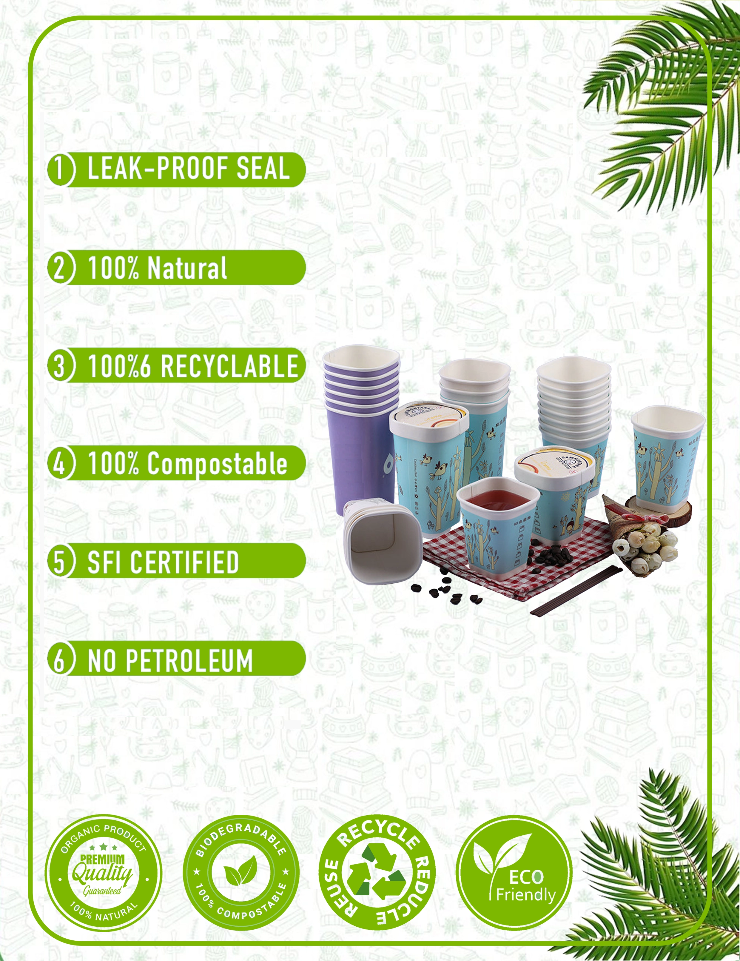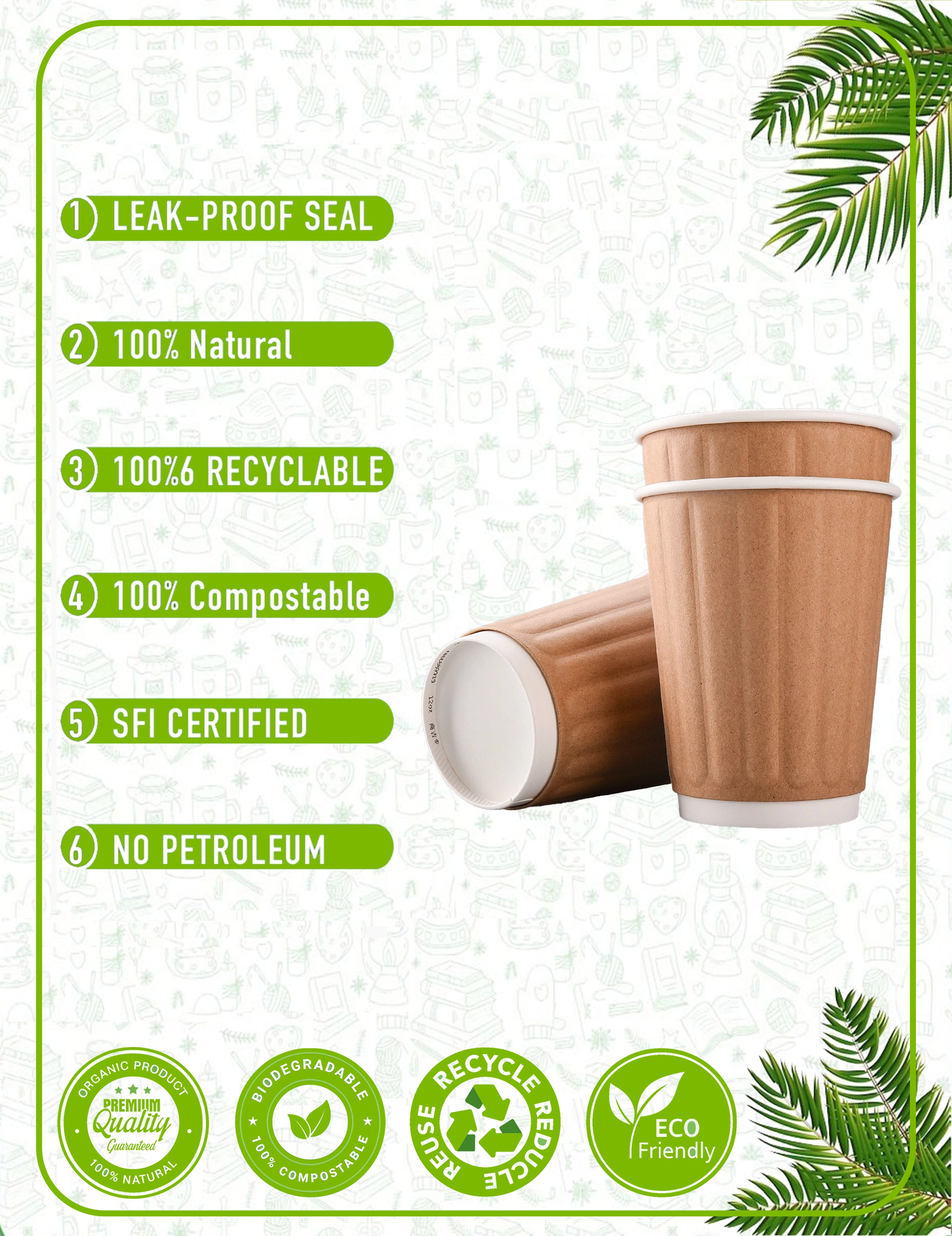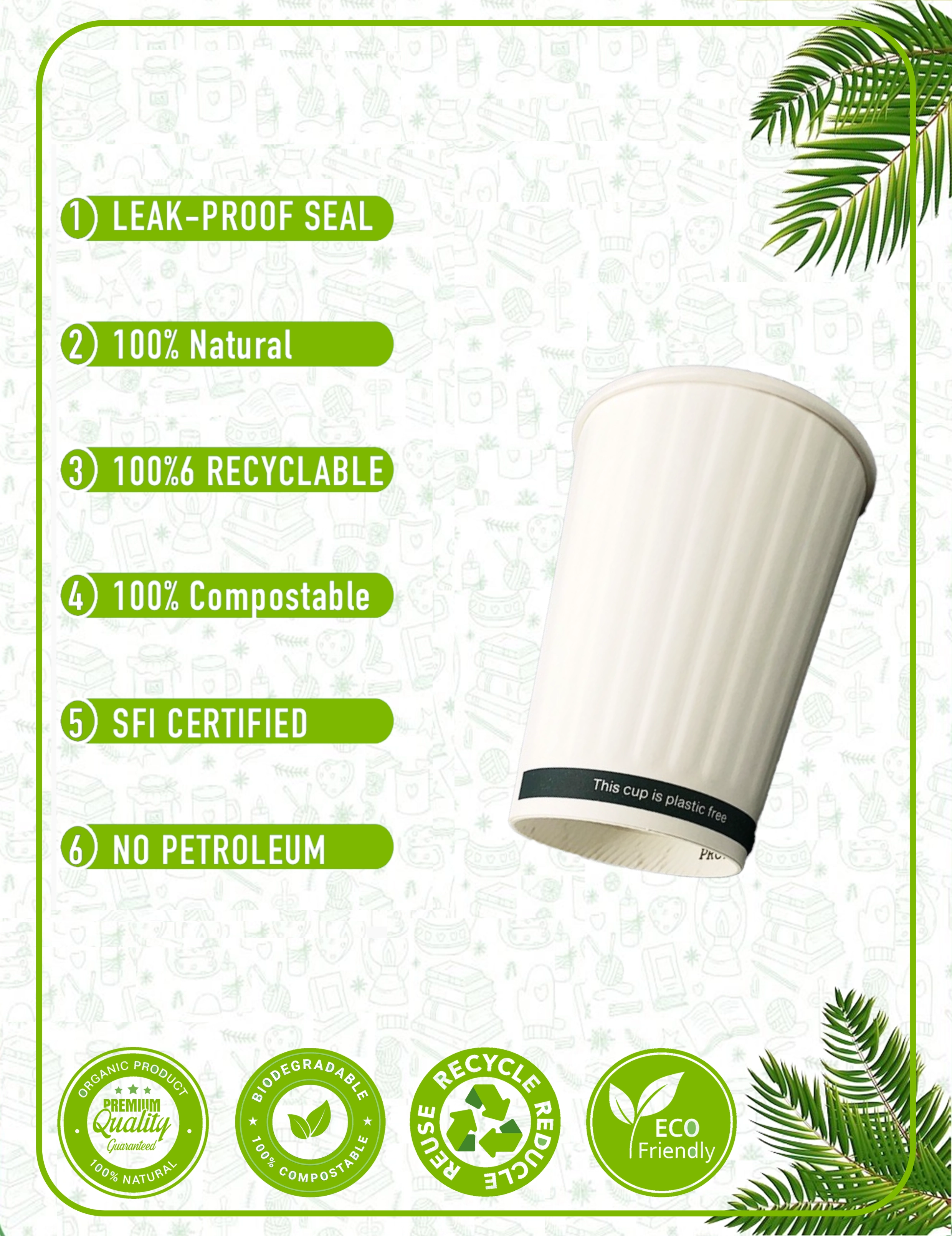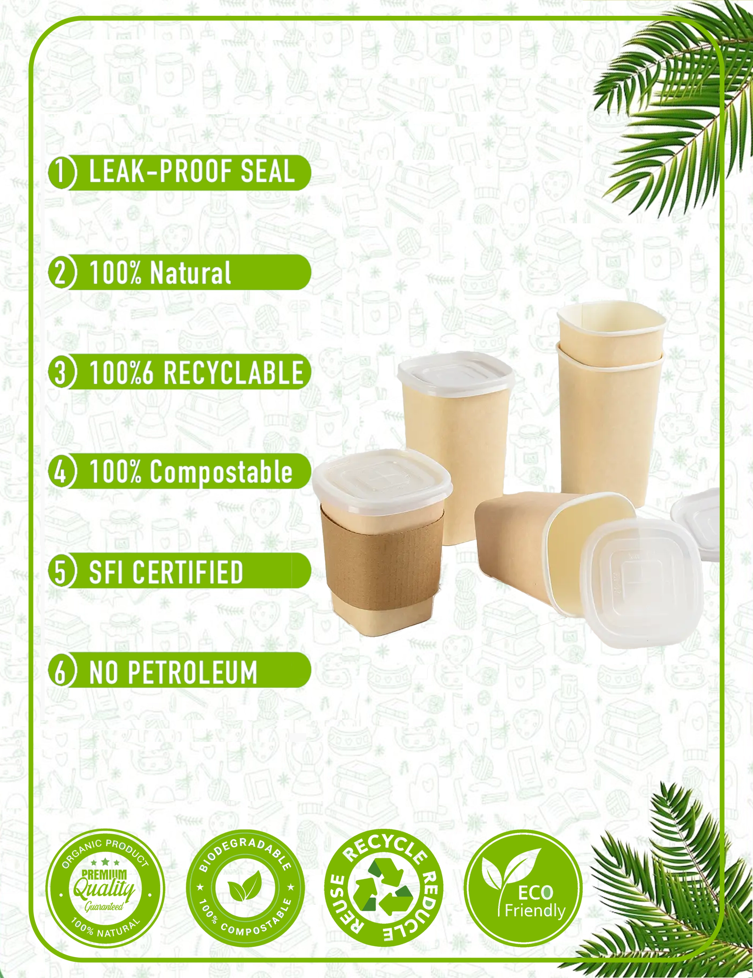 Our paper cups are crafted from responsibly sourced materials with plant-based linings. We prioritize eco-friendly solutions that reduce environmental impact without compromising quality. Every cup and packaging accessory is designed with circular economy principles in mind - from recyclable paper cups to compostable lids and biodegradable sleeves.