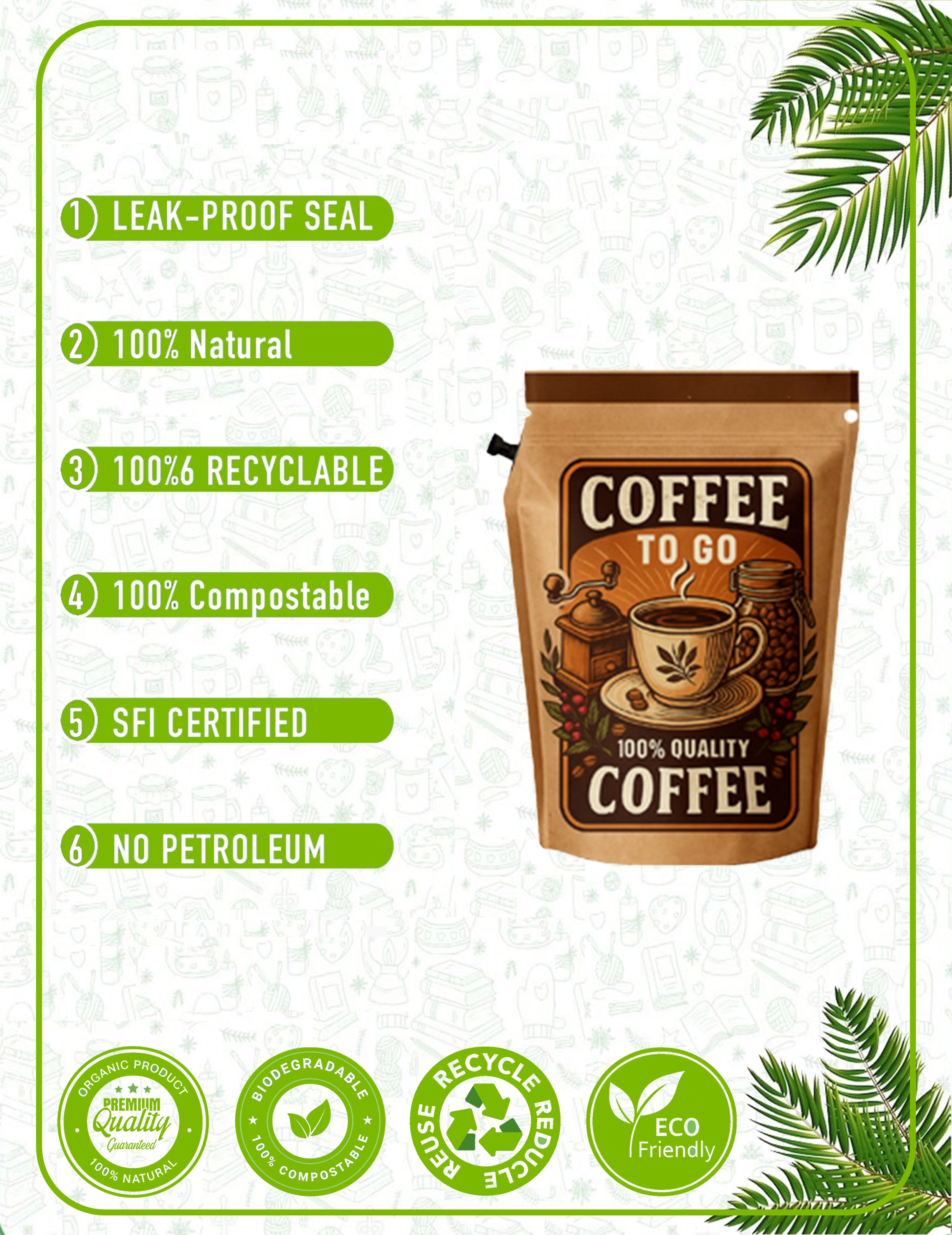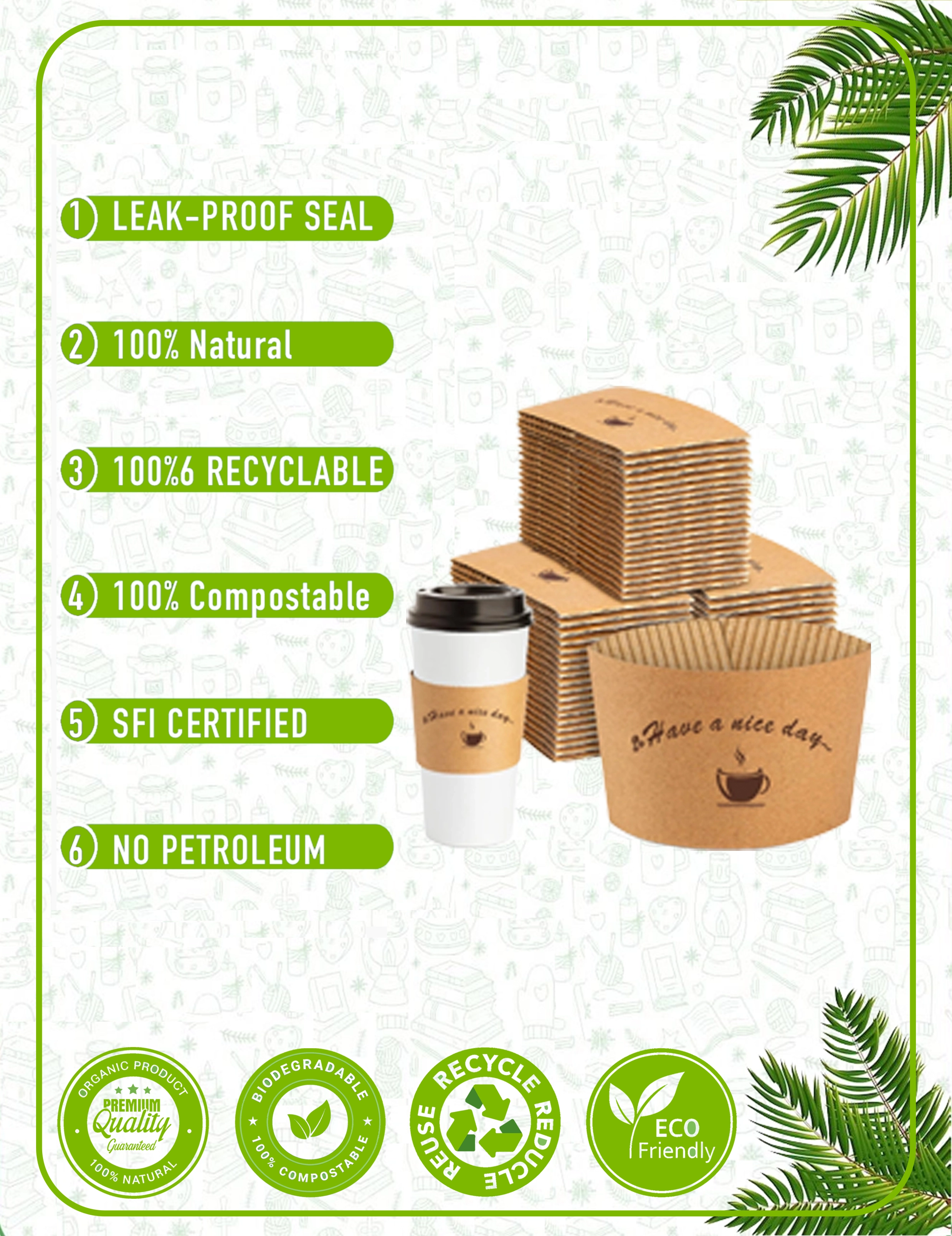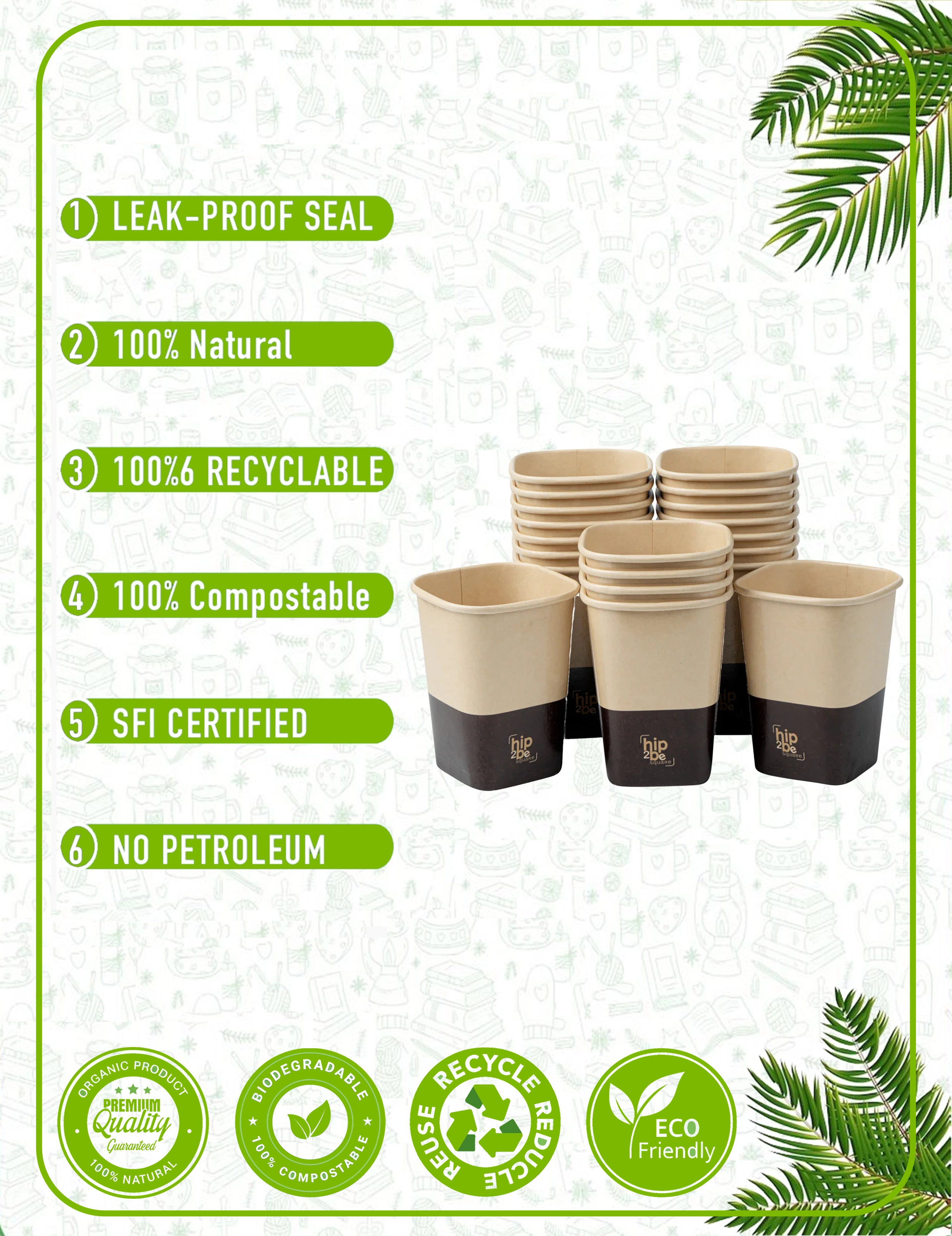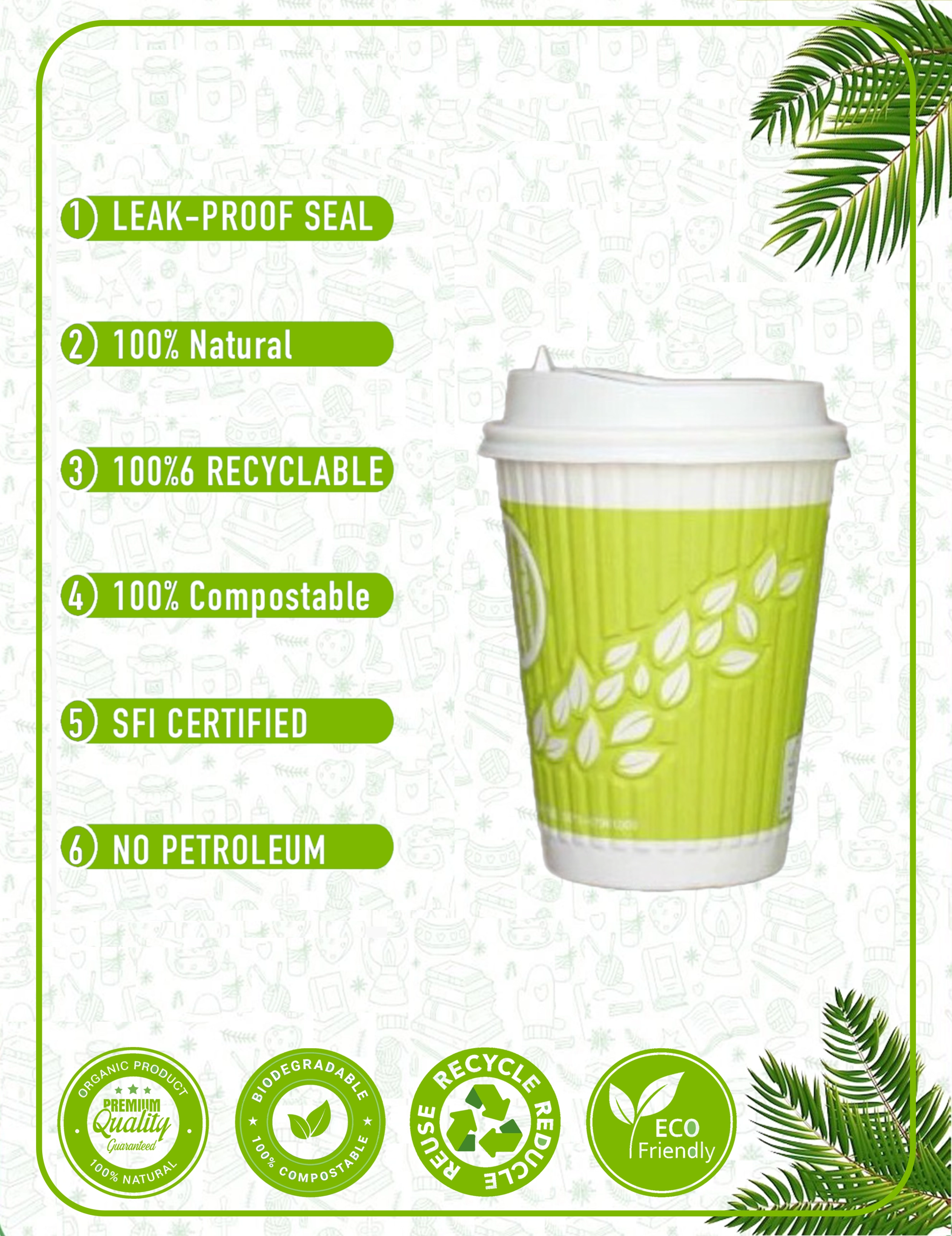 Our paper cups are crafted from responsibly sourced materials with plant-based linings. We prioritize eco-friendly solutions that reduce environmental impact without compromising quality. Every cup and packaging accessory is designed with circular economy principles in mind - from recyclable paper cups to compostable lids and biodegradable sleeves.